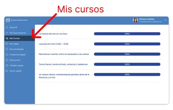 Al ingresar a MI PERFIL, opción MIS CURSOS, podrás ver los cursos o talleres a las que te inscribiste.