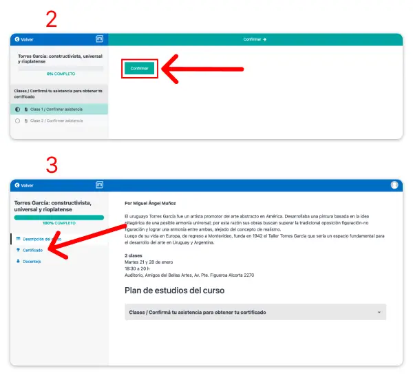 Para obtener tu certificado, debes confirmar el 100% de asistencia a las clases desde tu PERFIL, opción MIS CURSOS. Una vez realizado este paso, se habilitará automáticamente la descarga de tu certificado en formato pdf.